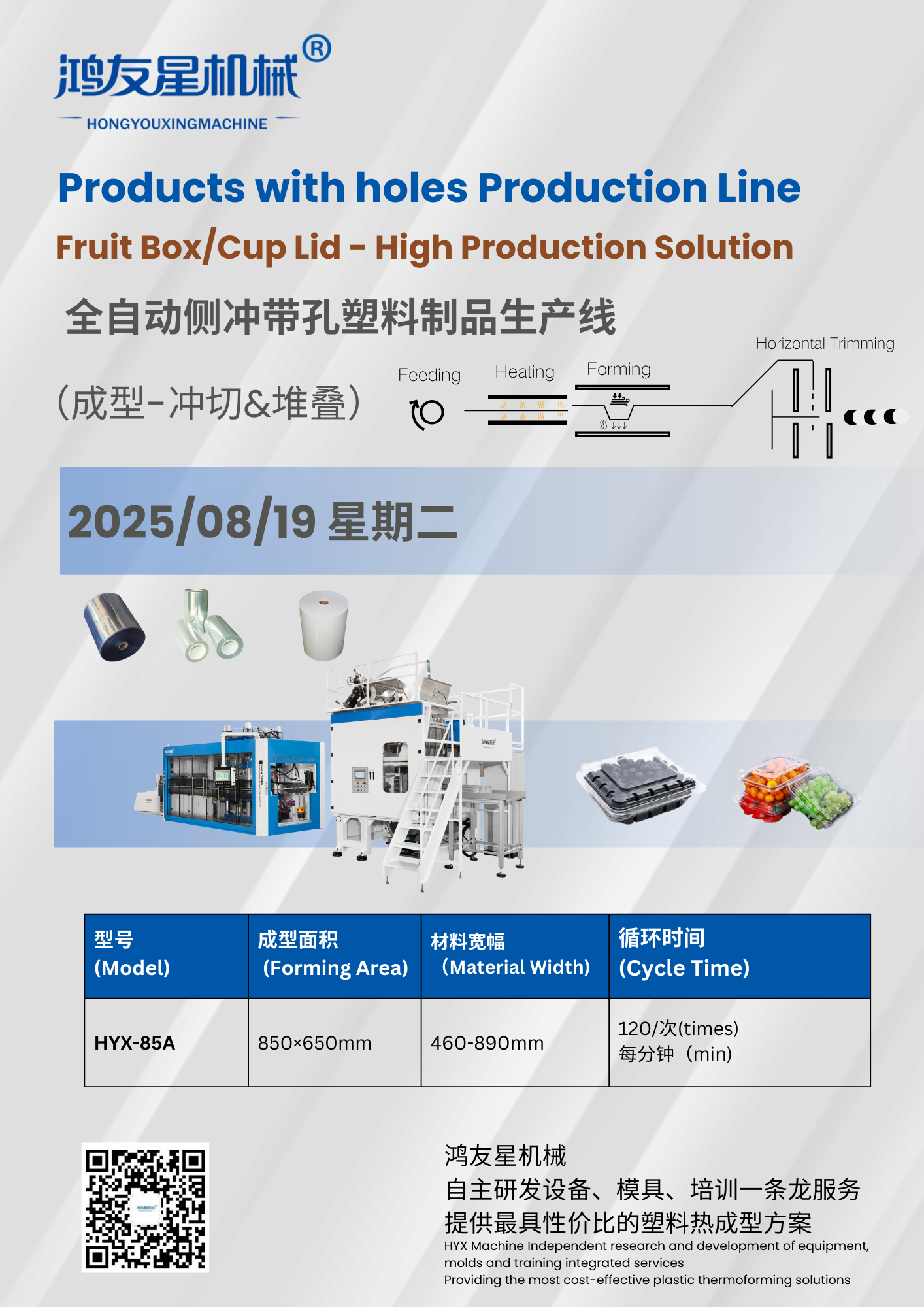 Potrivit pentru producerea de capace pentru pahare, cutii de căpșuni și cutii blister cu găuri laterale și inferioare, mașini de formare a blisterelor (cunoscute și sub denumirea de mașini blister/mașini de testare a poansonului) sunt echipamente extrem de automatizate capabile să îndeplinească cerințe complexe de ambalare și sunt utilizate în special pe scară largă în industria de ambalare a alimentelor. Aceste mașini nu numai că acceptă formarea blisterelor convenționale, ci și creează cu precizie diferite poziții ale găurilor, cum ar fi găurile laterale și inferioare, pentru a îndeplini diverse cerințe funcționale de ambalare.